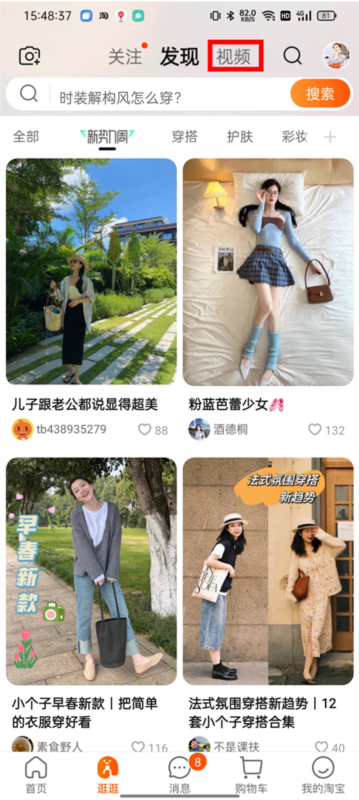 2、進入到逛逛頁面之后,點擊上方的淘寶客戶端視頻進入到短視頻頁面;
